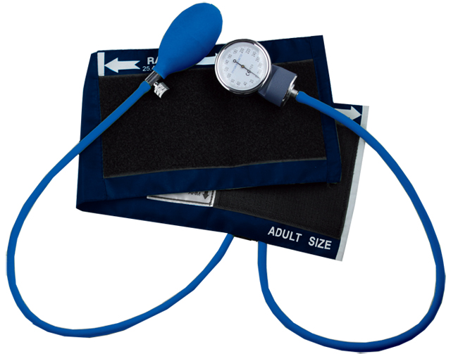 Sfigmomanometro classico per adulti, con bracciale in tessuto con chiusura velcro e manometro staccato agganciabile sul bracciale per facilitare la lettura.