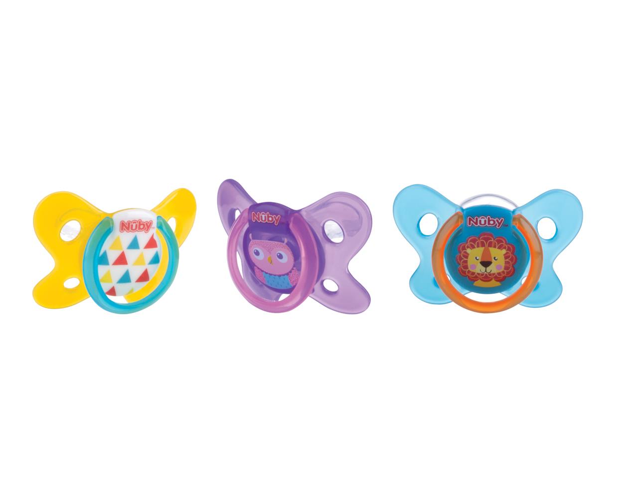 Confezione da 6 ciucci di vari colori e figure.