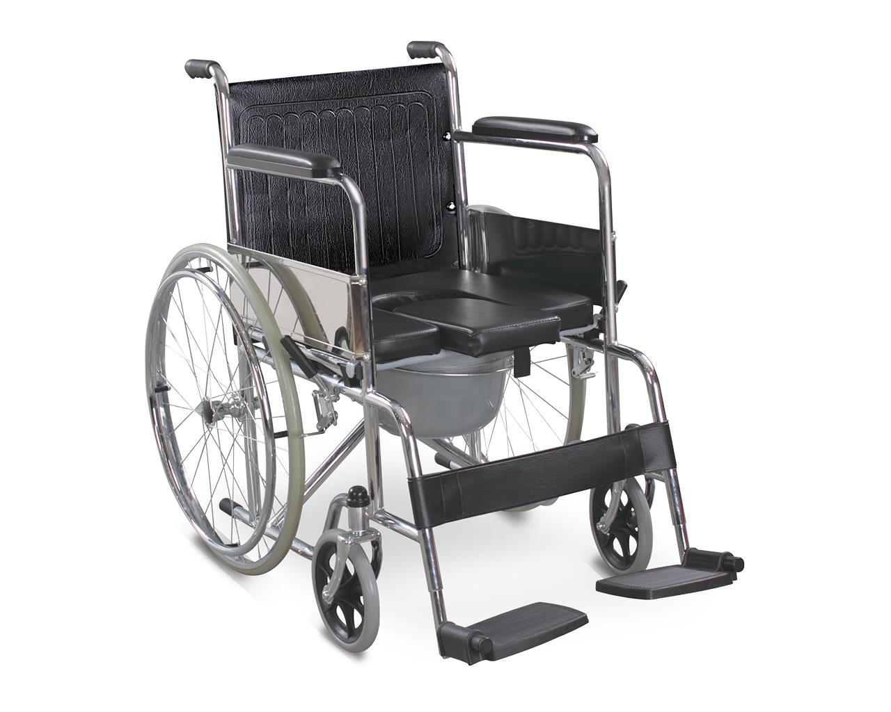 Sedia a rotelle e comoda con struttura in acciaio cromato, ideale per pazienti con mobilità ridotta. Braccioli e poggiapiedi fissi, rotelle solide e ruote posteriori robuste.
