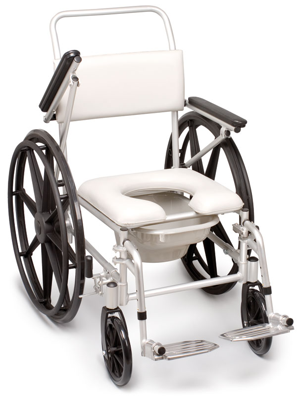 Sedia per doccia e per bagno. Struttura totalmente in alluminio anodizzato, braccioli ribaltabili, pedane poggiapiedi in alluminio ribaltabili lateralmente, estraibili e regolabili in lunghezza. Sedile e schienale imbottiti in PVC termosaldato. WC disponibile (opzionale).