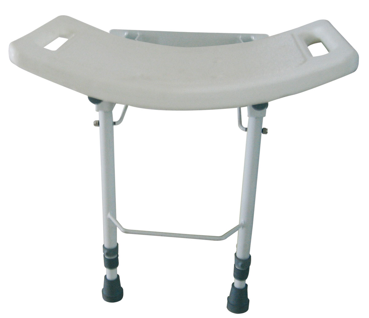 Sedile da parete per doccia dotato di piedi di appoggio al pavimento. Struttura in acciaio verniciato a polveri, idonea ad essere installata a parete nella stanza da bagno. Pieghevole per salvare spazio. Ribaltabile con appoggio a parete.