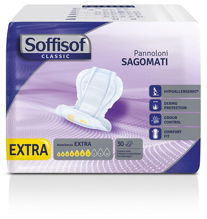 Il pannolone Sagomato Soffisof Classic Extra è indicato per incontinenza urinaria e/o fecale da moderata a grave e assicura la massima sicurezza e comfort a utilizzatori sia autosufficienti che allettati. Il materassino assorbente, sagomato anatomicamente, è costituito da fluff di cellulosa vergine a fibra lunga certificata PEFC maggiormente concentrata nella porzione centrale. Le ampie dimensioni anteriori e posteriori e la presenza di speciali polimeri gelatinizzanti (SAP) con funzione super assorbente e di eliminazione degli odori, garantiscono la massima efficacia in tutte le situazioni. Il telino filtrante in morbido tessuto non tessuto a contatto con la cute è dermatologicamente testato e imbibito con Aloe per una maggiore protezione della cute. Lo strato esterno impermeabile, è in morbido politene 100% . Sempre sul lato esterno è presente un pratico indicatore di cambio che permette di verificare il grado di saturazione della protezione. La protezione viene fissata al corpo con le apposite mutandine elastiche riutilizzabili.