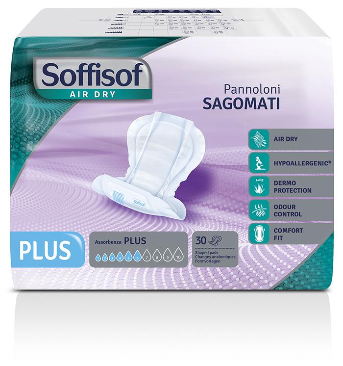 Il pannolone Sagomato Soffisof Air Dry Plus è indicato per incontinenza urinaria e/o fecale da leggera a media e assicura la massima sicurezza e comfort a utilizzatori sia autosufficienti che allettati. Il materassino assorbente, sagomato anatomicamente, è costituito da fluff di cellulosa vergine a fibra lunga certificata PEFC maggiormente concentrata nella porzione centrale. Le ampie dimensioni anteriori e posteriori e la presenza di speciali polimeri gelatinizzanti (SAP) con funzione super assorbente e di eliminazione degli odori, garantiscono la massima efficacia in tutte le situazioni. Il telino filtrante in morbido tessuto non tessuto a contatto con la cute è dermatologicamente testato e imbibito con Aloe per una maggiore protezione della cute. Lo strato esterno impermeabile, in politene 100% traspirante accoppiato a tessuto non tessuto, assicura l’areazione della cute prevenendo macerazioni e irritazioni. Sempre sul lato esterno è presente un pratico indicatore di cambio che permette di verificare il grado di saturazione della protezione. La protezione viene fissata al corpo con le apposite mutandine elastiche riutilizzabili.