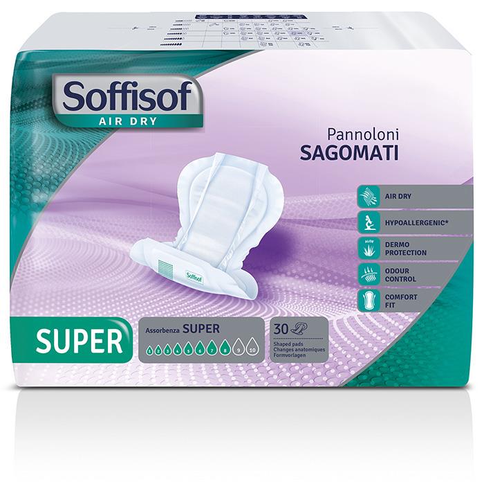 Il pannolone Sagomato Soffisof Air Dry Super è indicato per incontinenza urinaria e/o fecale da media a grave e assicura la massima sicurezza e comfort a utilizzatori sia autosufficienti che allettati. Il materassino assorbente, sagomato anatomicamente, è costituito da fluff di cellulosa vergine a fibra lunga certificata PEFC maggiormente concentrata nella porzione centrale. Le ampie dimensioni anteriori e posteriori e la presenza di speciali polimeri gelatinizzanti (SAP) con funzione super assorbente e di eliminazione degli odori, garantiscono la massima efficacia in tutte le situazioni. Il telino filtrante in morbido tessuto non tessuto a contatto con la cute è dermatologicamente testato e imbibito con Aloe per una maggiore protezione della cute. Lo strato esterno impermeabile, in politene 100% traspirante accoppiato a tessuto non tessuto, assicura l’areazione della cute prevenendo macerazioni e irritazioni. Sempre sul lato esterno è presente un pratico indicatore di cambio che permette di verificare il grado di saturazione della protezione. La protezione viene fissata al corpo con le apposite mutandine elastiche riutilizzabili.