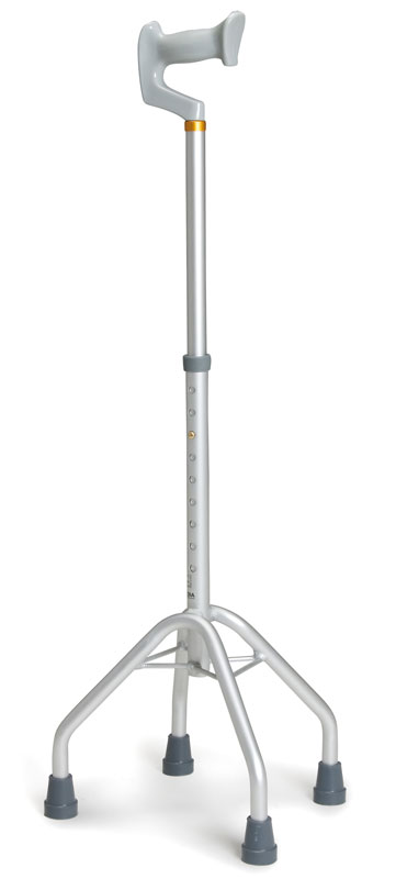 Quadripode base larga con manico aperto, impugnatura anatomica. Interamente realizzato in alluminio anodizzato. puntali antiscivolo in gomma morbida.
